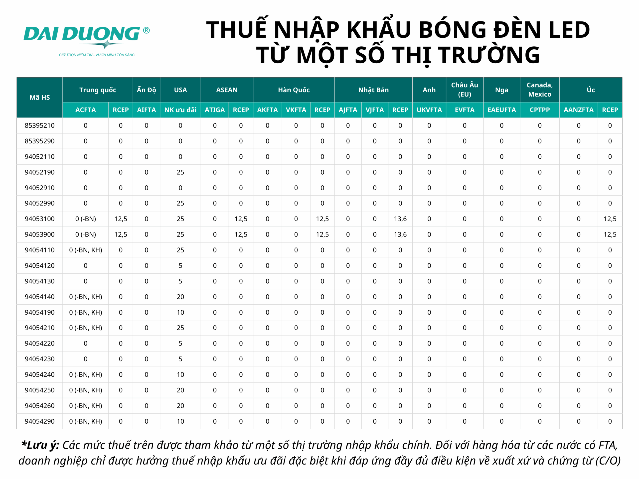 Dựa trên bảng tổng hợp thuế nhập khẩu từ các thị trường lớn, có thể thấy phần lớn các dòng sản phẩm bóng đèn LED hiện nay đang được hưởng mức thuế khá ưu đãi, đặc biệt khi nhập khẩu từ các quốc gia có ký kết hiệp định thương mại tự do (FTA) với Việt Nam.