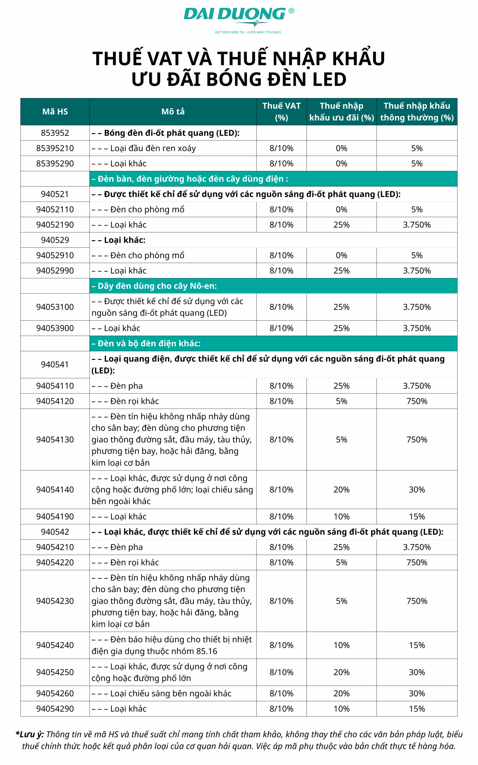 - Thuế giá trị gia tăng (VAT): Thông thường áp dụng mức 10% đối với bóng đèn LED. Thuế này được tính trên tổng giá trị sau khi đã cộng thuế nhập khẩu.